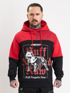| Der Hoodie kombiniert einen roten Grundton mit schwarzen Kontrasteinsätzen an Brust und Ärmeln. Auf der Vorderseite dominiert ein großflächiger Print mit Dog-Motiv und markanter Typografie. Der Rücken wird durch einen klar strukturierten „Ruff Rugged Raw“-Schriftzug ergänzt. Weitere Printdetails auf Brust und Rücken sorgen für Tiefe und Wiedererkennungswert. Kapuze mit Tunnelzug sowie breite Rippbündchen an Ärmeln und Saum runden das Design funktional ab. |